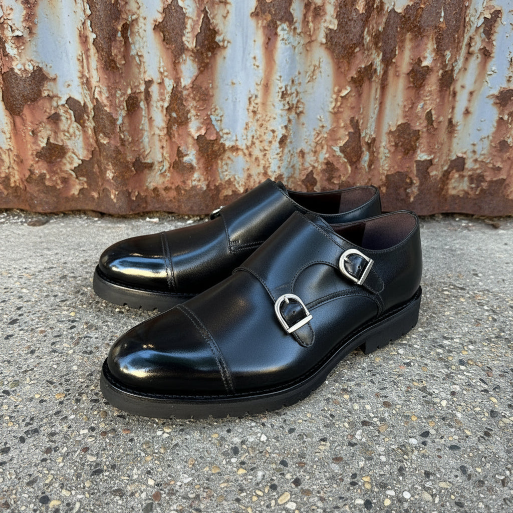 Double-boucles à semelle commando recyclée. Ce modèle double-boucles à bout rapporté est réalisé en montage Goodyear avec une semelle commando en caoutchouc recyclé. Esthétique élégante avec un léger bout biseauté