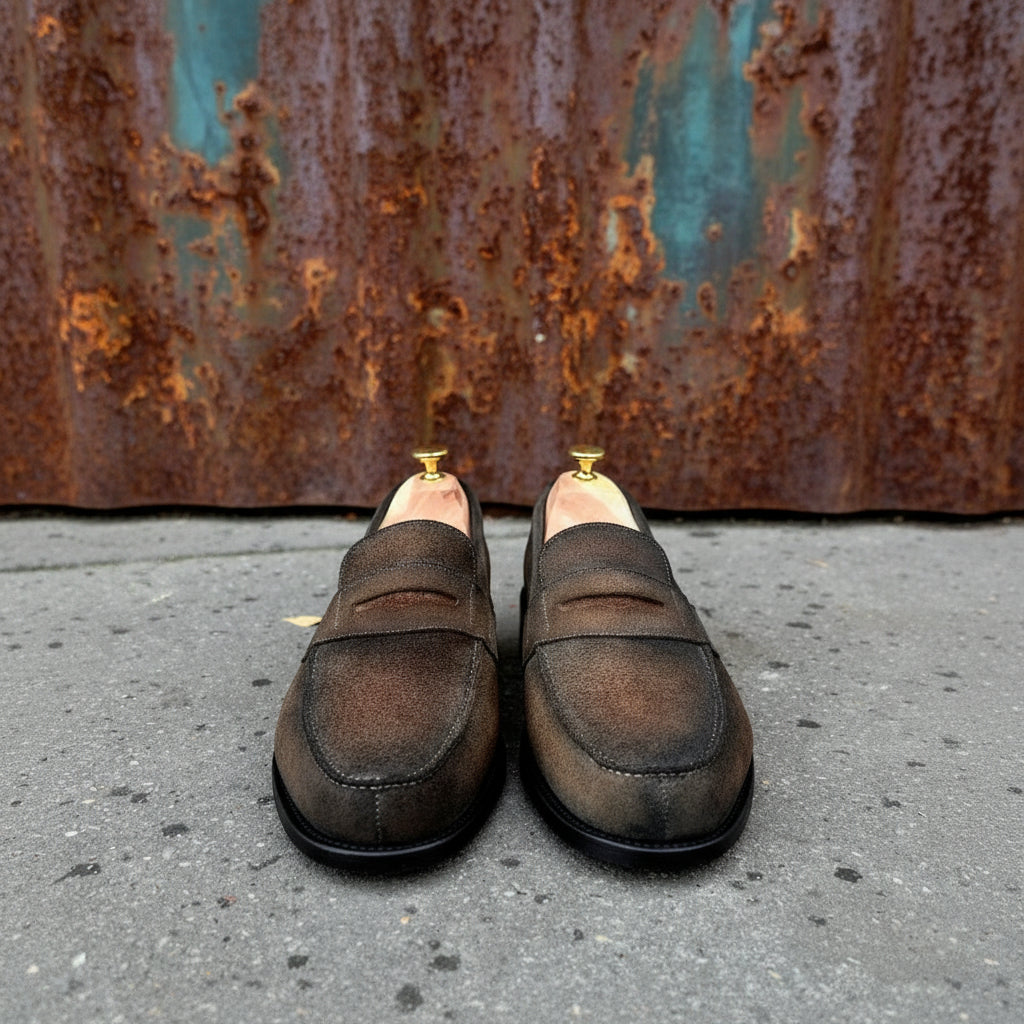 Ce Mocassin "Penny loafer" est réalisé en montage Goodyear avec les meilleures peausseries veau velours naturel à patiner.
